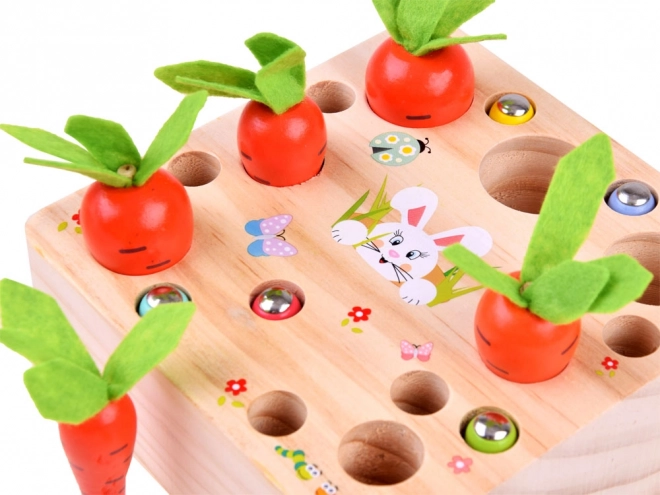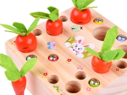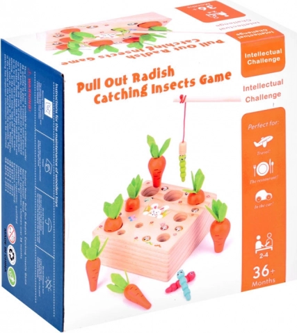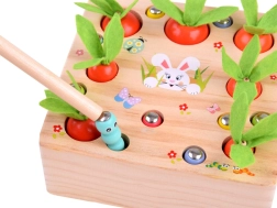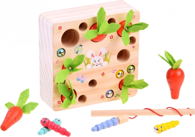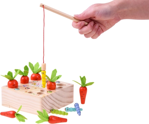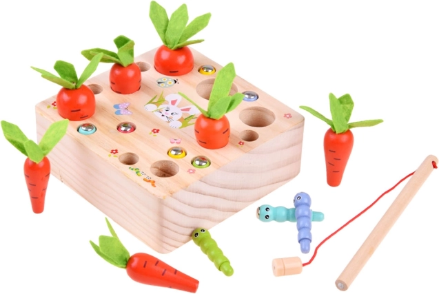 Das Holzspiel mit Möhrchen und Würmchen ist für die Kleinsten konzipiert, begeistert mit seiner bunten Farbgebung und fröhlichen Motiven. Kinder können spielerisch Möhren und Würmchen mit magnetischen Angeln ernten, was ihre Hand-Auge-Koordination und Feinmotorik stärkt.