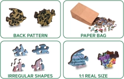 Die Verpackung enthält eine separate Vorlage, die das Puzzeln erleichtert, und alles wird in einer umweltfreundlichen Papierschachtel aufbewahrt. Das Puzzle besteht aus einer stabilen HDF-Platte aus Holzfasern mit einer Dicke von 3-4 mm.