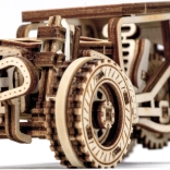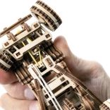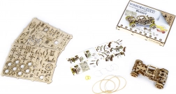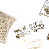 Lasergeschnittene Teile aus Birkensperrholz passen präzise ineinander. Für einen reibungslosen Lauf genügt es, Achsen und Zahnräder gemäß Anleitung zu wachsen.