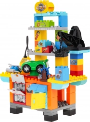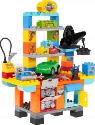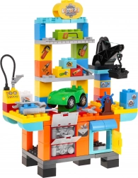 Baut einen kompletten Workshop mit Werkbank, Hebebühne und Aufbewahrungsschränken. Bunte Bausteine fördern Fantasie und selbstständiges Spiel.