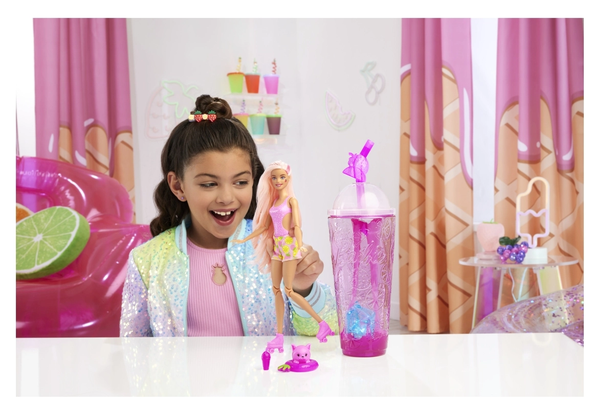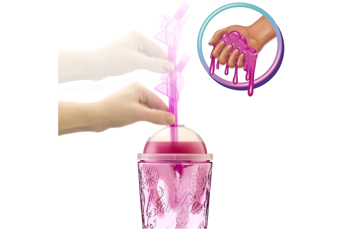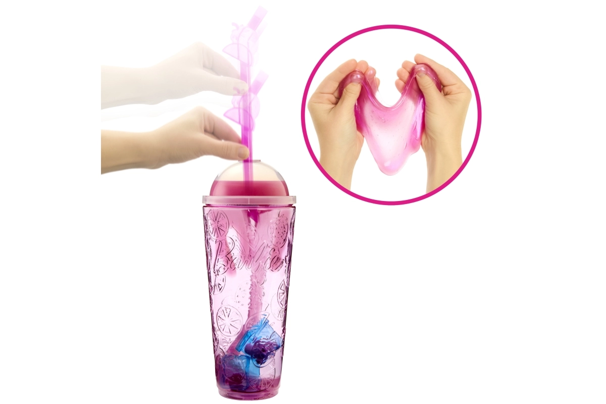 Nimm die Überraschungen aus dem Becher, setze den Deckel wieder auf und stecke den „Strohhalm“ hinein – der weiche rosa Schleim fließt über die Eiswürfel und enthüllt verborgene Accessoires. Innen findest du eine bewegliche BARBIE Puppe mit Fruchtduft, ein kuscheliges, duftendes Tierchen, Mode und thematische Kleinteile.