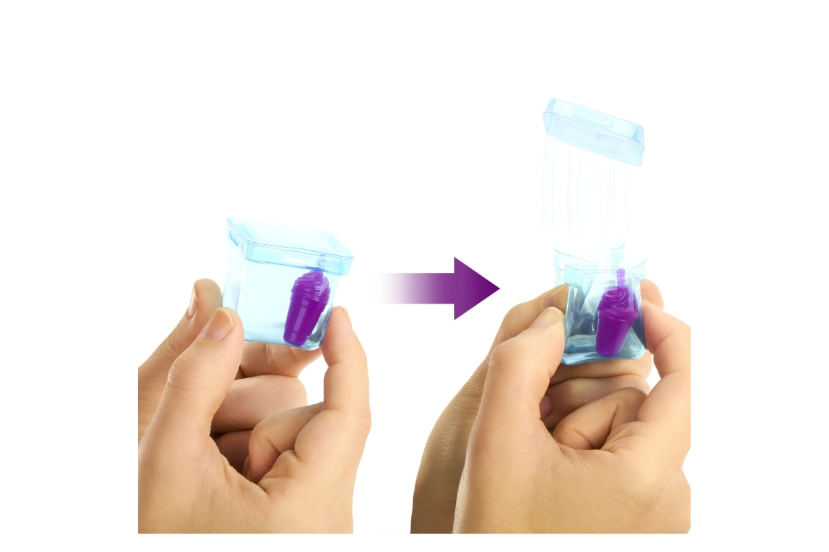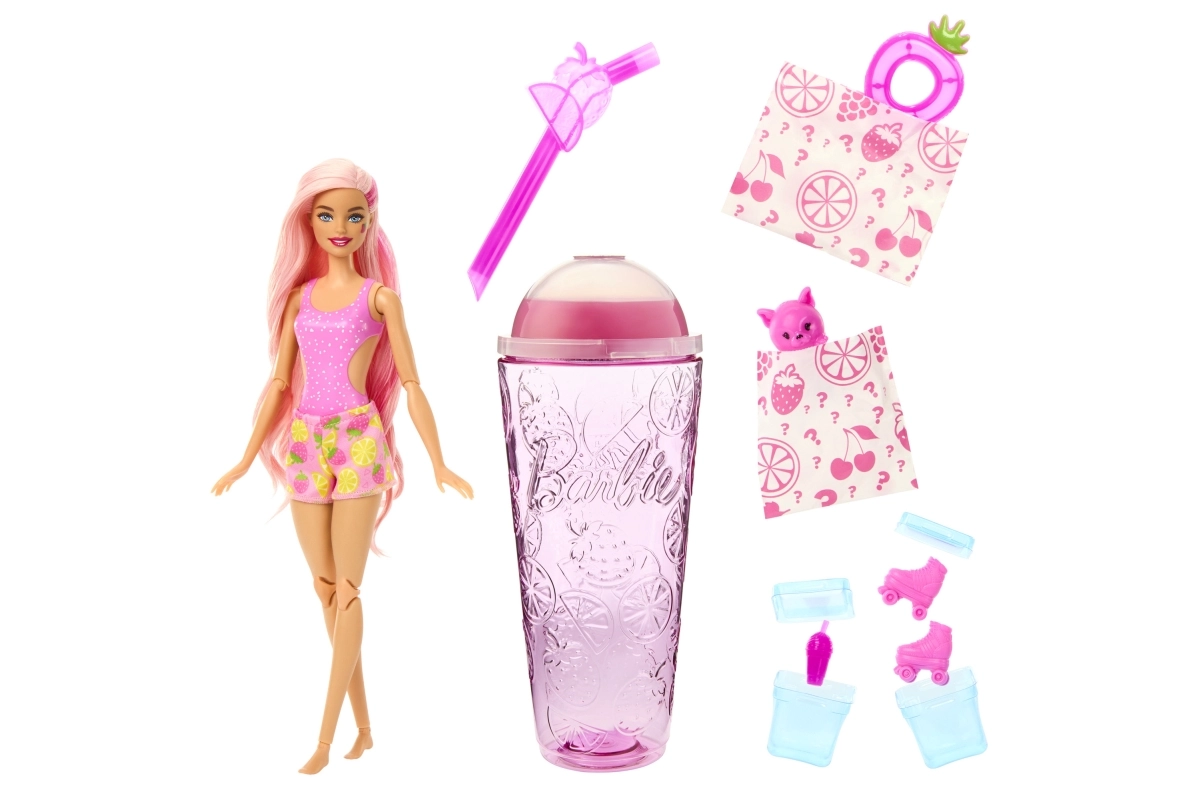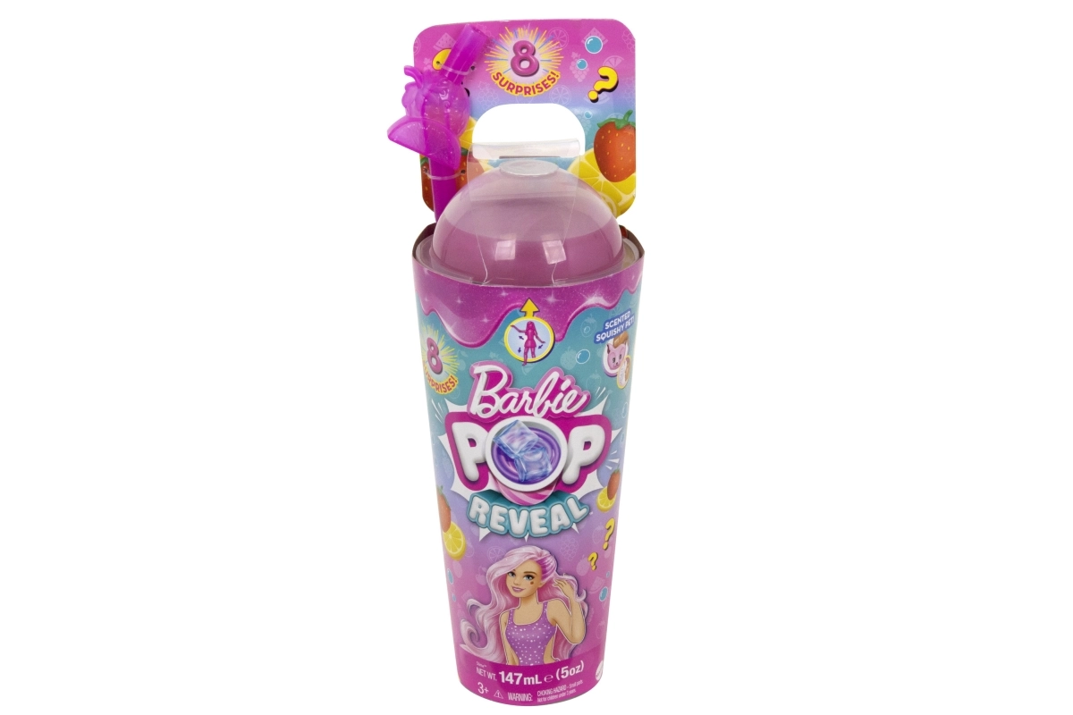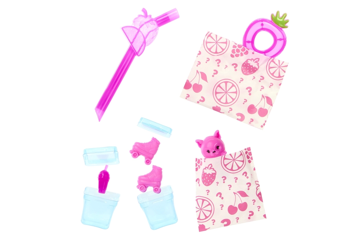 Nimm die Überraschungen aus dem Becher, setze den Deckel wieder auf und stecke den „Strohhalm“ hinein – der weiche rosa Schleim fließt über die Eiswürfel und enthüllt verborgene Accessoires. Innen findest du eine bewegliche BARBIE Puppe mit Fruchtduft, ein kuscheliges, duftendes Tierchen, Mode und thematische Kleinteile.