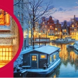 Das Bild zeigt Amsterdam im nächtlichen Licht und schafft so eine spezielle Atmosphäre.