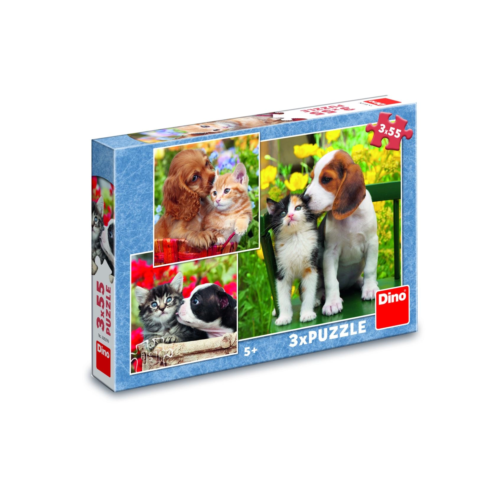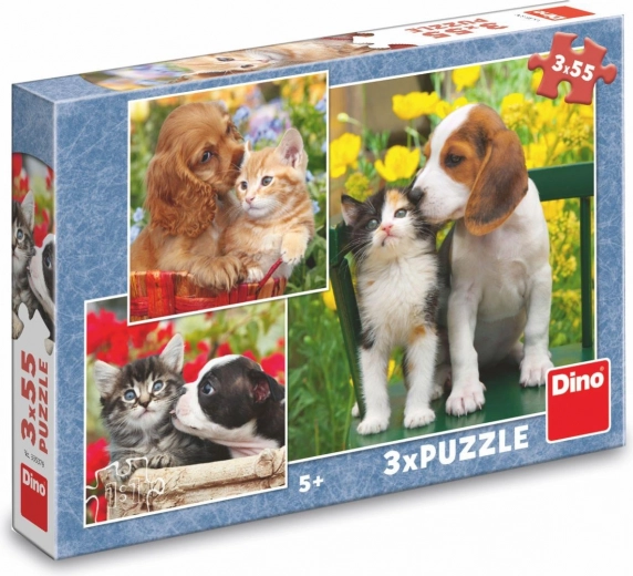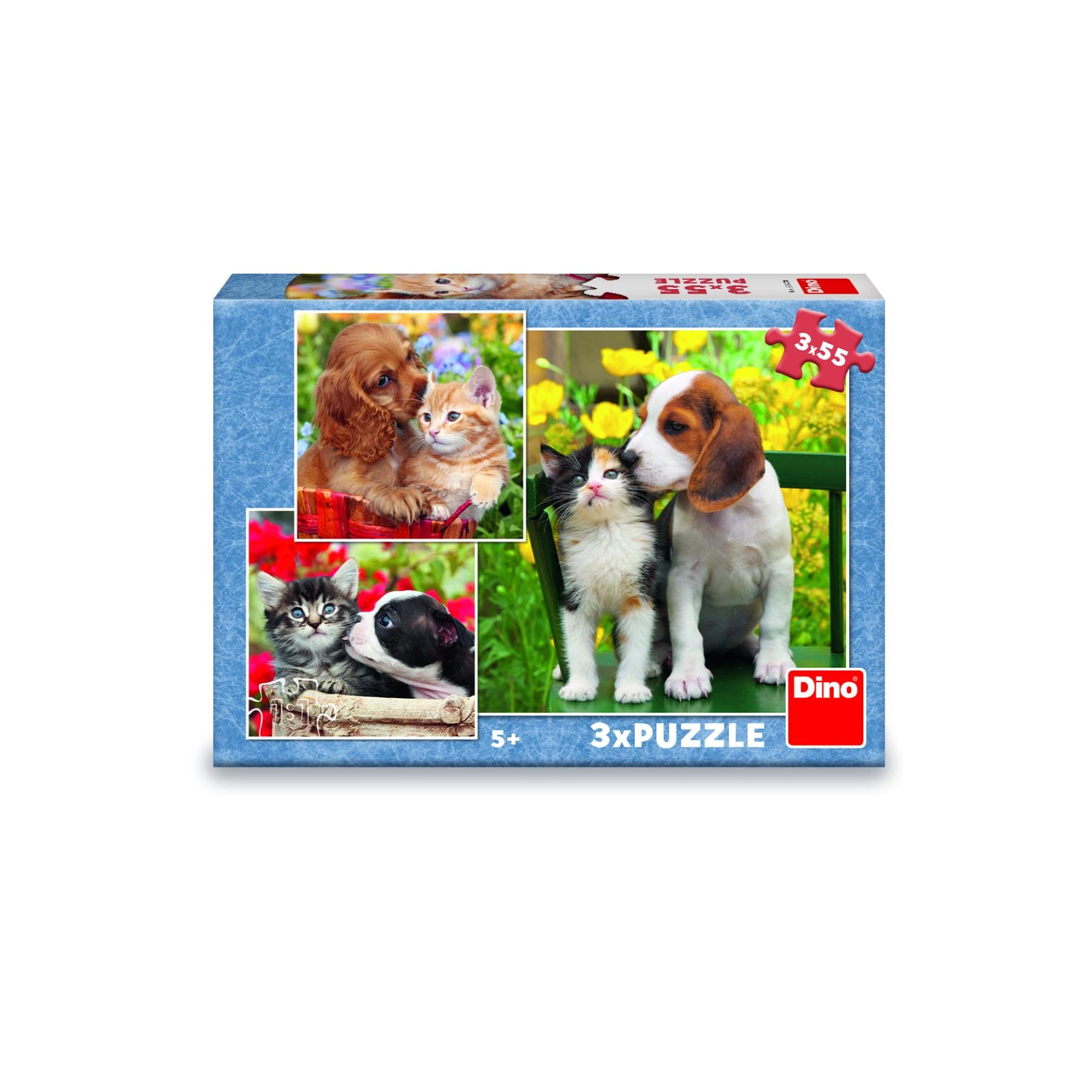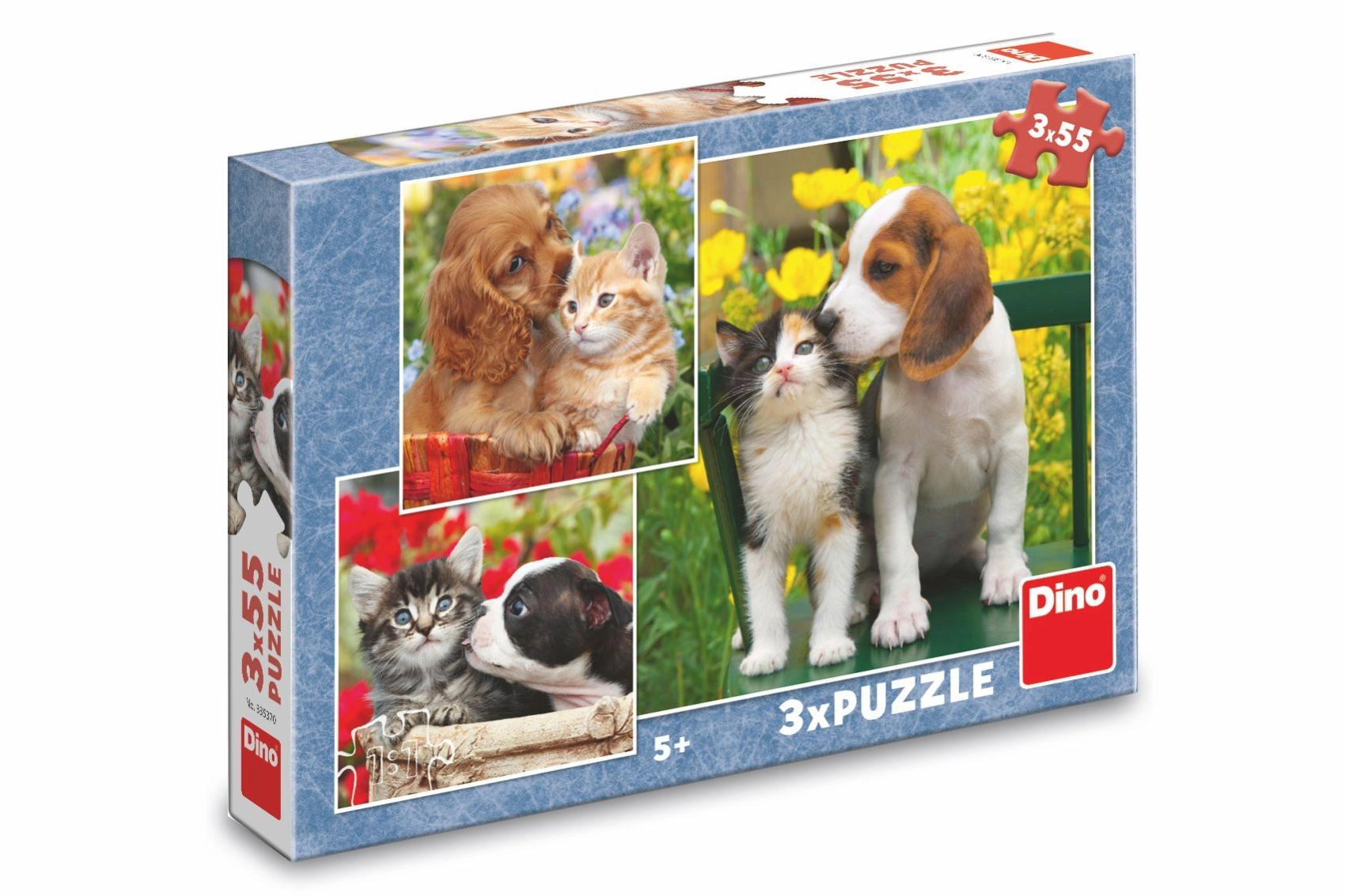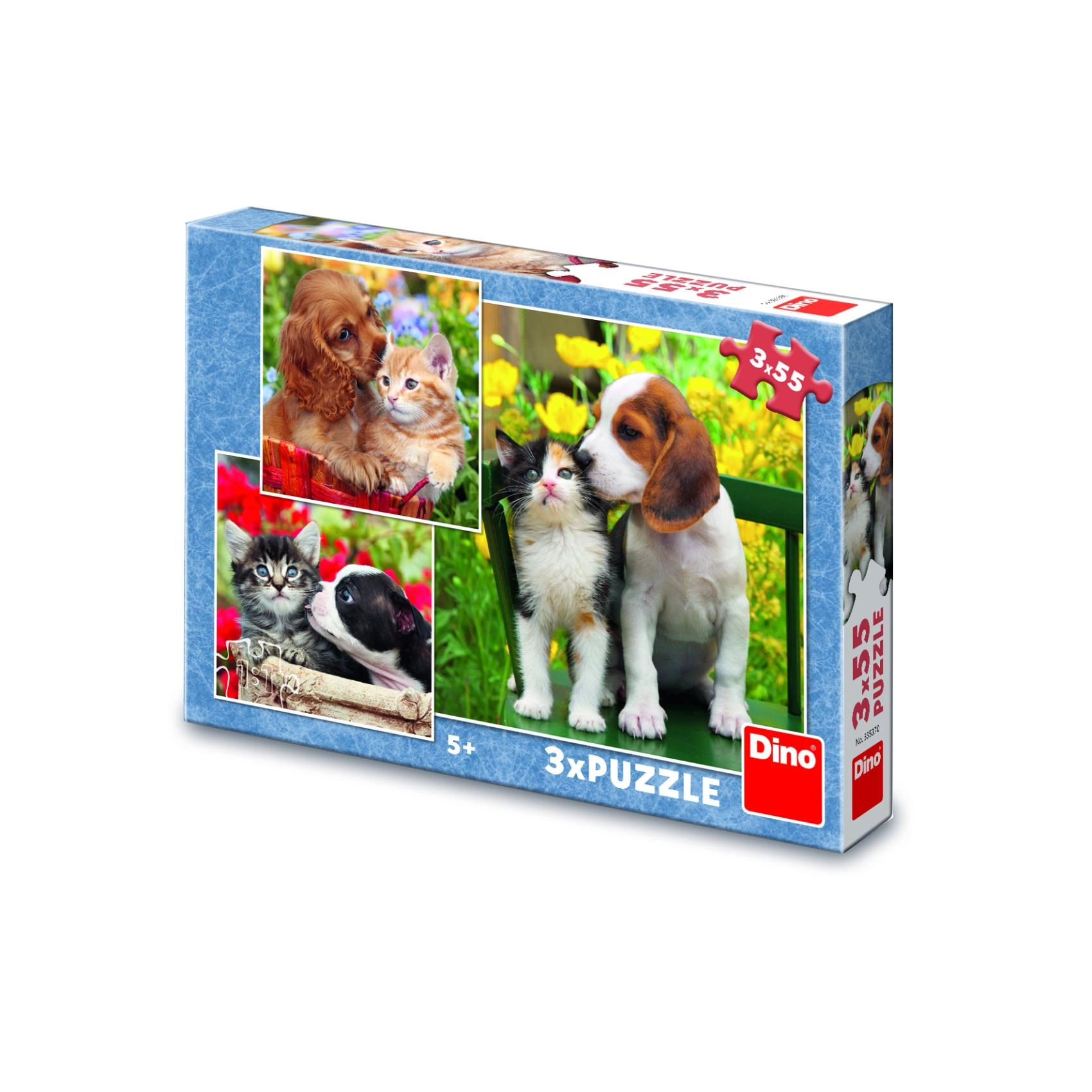 Drei unterschiedliche Puzzles mit einem freundlichen Kätzchen-Welpen-Duo auf jedem Bild begeistern kleine Tierfreunde und Eltern, die sinnvolle Unterhaltung suchen. Jedes der 55 Teile greift präzise ineinander und dank hochwertigem Druck kommen satte Farben und feine Details bestens zur Geltung.
