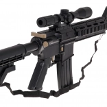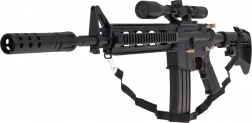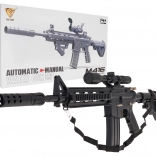Das große militärische Gelgewehr M4 ist für Kinder ab 14 Jahren bestimmt. Es sollte mit speziellen Hydrogellkugeln verwendet werden, die beim Auftreffen auf das Ziel zerplatzen. In diesem Modell sollten Kugeln mit einem Durchmesser von 7–8 mm verwendet werden. Zum Set gehört ein Beutel mit ungequollenen Kugeln. Die Kugeln werden vorbereitet, indem man sie mit Wasser übergießt und etwa 4–6 Stunden stehen lässt; anschließend das überschüssige Wasser abgießen – fertig sind die „Munitionen“. Die Gewehre verfügen über einen manuellen und einen automatischen Schussmodus. Das Zielfernrohr ist mit einer Lupe ausgestattet, und mithilfe eines Rädchens kann die Zielentfernung eingestellt werden. Das Spielzeug wird von einem 3,7-V-Akku betrieben, der im Set enthalten ist. |