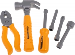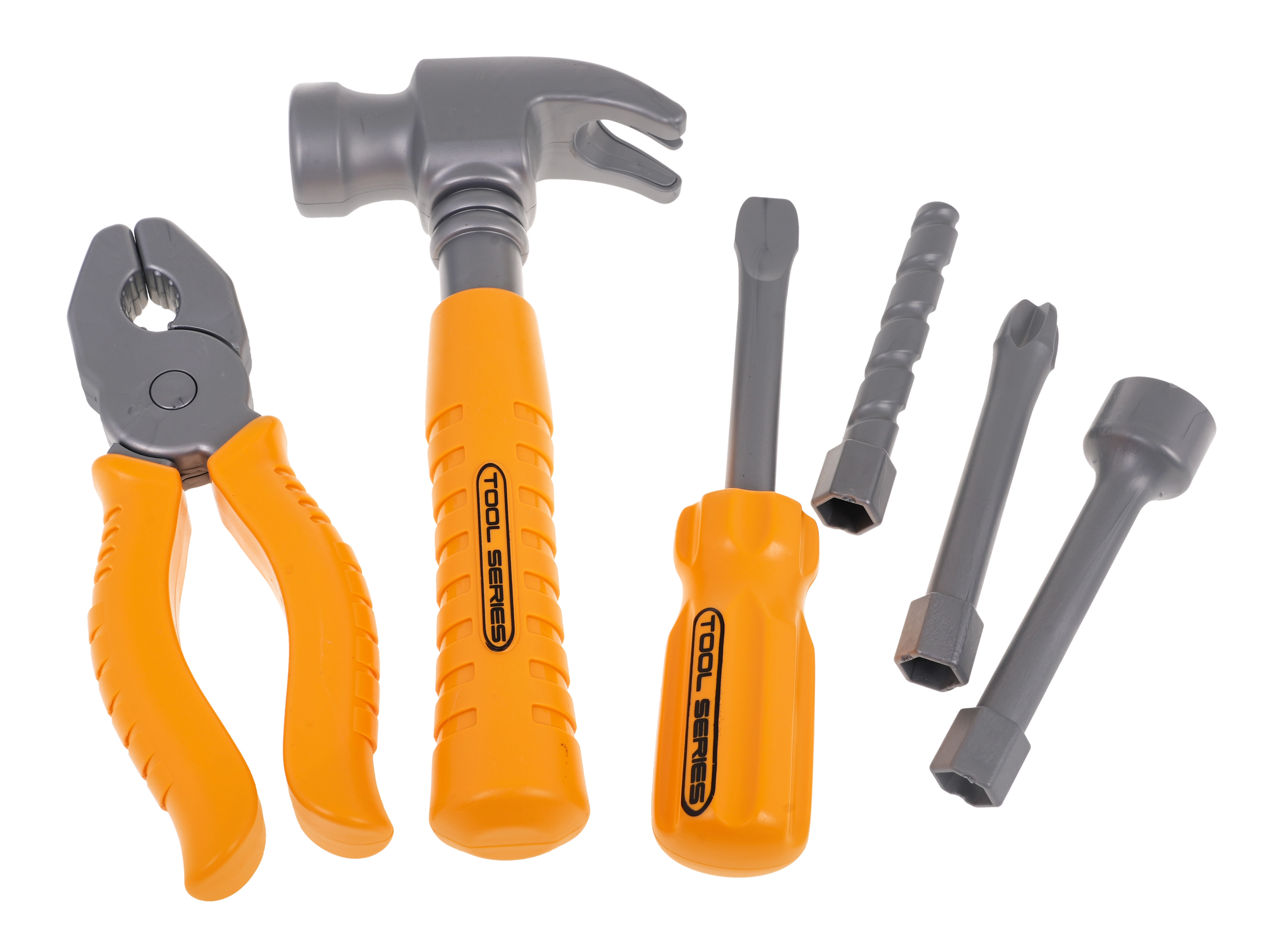 - Verschiedene Werkzeuge wie Schraubendreher, Winkellineal, Schlüssel und Schrauben.