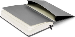 Das Notizbuch ist mit einem elastischen Band zum Verschließen und einem Lesezeichen ausgestattet, um die Seite leicht zu finden.