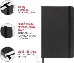 Stabiles Hardcover mit Gummiband, Innenfach und Stiftschlaufe halten alles zusammen und sicher verschlossen.