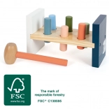 Diese hochwertige Klopfbank aus FSC® 100% Holz ist ideal für die ersten Fähigkeiten kleiner Baumeister. Kinder klopfen mit dem Holzhammer farbige Stäbe in die Bank und setzen das Spiel nach Abschluss durch einfaches Umdrehen fort. Der seitliche Druck mit Eisbär macht auch kopfstehend visuell Sinn.