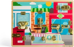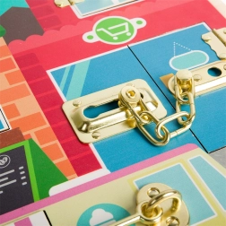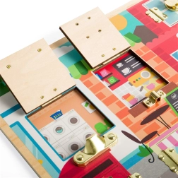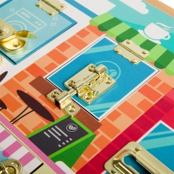 Verschiedene Mechanismen – Kippverschluss, Riegel, Scharniere, Ketten-Schiebeschloss, Vorhängeschloss-Riegel, Drehverschluss sowie Haken mit Öse – helfen Kindern, gängige häusliche Verschlüsse zu verstehen und verbessern die Bewegungsgenauigkeit. Die Tafel besteht aus verantwortungsvoll gewonnenem Holz und robusten Metall komponenten.