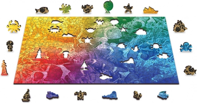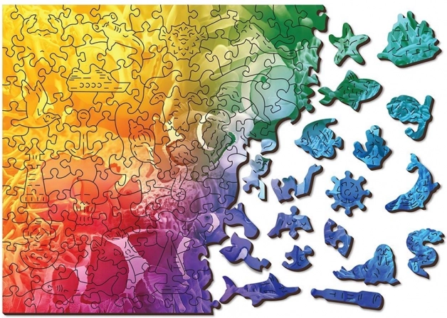 Erleben Sie die farbenfrohe Unterwasserwelt mit dem Motiv tropischer Fische und einem Spielspaß, der nicht so schnell vergeht. Dank lasergeschnittener Teile und Dutzender origineller Formen erwartet Sie eine fesselnde Herausforderung. Das Puzzle ist beidseitig – vorne legen Sie das farbige Motiv, hinten ein sich wiederholendes Muster nach Formen.