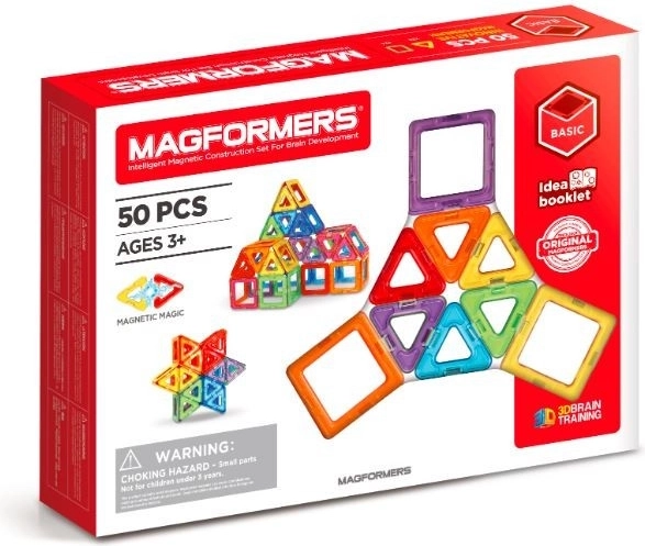 MAGFORMERS SET 50 sind Bausteine mit eingebauten starken Neodym-Magneten, die sich stets gegenseitig anziehen. Es genügt, die Seiten zweier Bausteine einander zu nähern, und sie verbinden sich sofort. Dank der Bausteine, die nach geometrischen Formen gestaltet sind, können Sie wunderschöne dreidimensionale Konstruktionen bauen. Für das Spiel können Sie die beiliegende Anleitung verwenden, weitere Beispiele auf magformersworld.com anschauen oder Ihrer eigenen Fantasie folgen. Das Set enthält: 26 Dreiecke und 24 Quadrate.