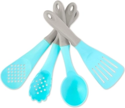 Ein Set aus Löffel, Schöpflöffel, Pfannenwender und Serviergabel ist ideal für „haftfreies Kochen“ und sicheres Spielen ohne scharfe Kanten.