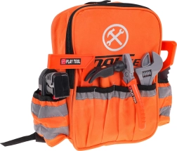 Orangener Rucksack mit mehreren Taschen zur Aufbewahrung von Spielzeug. Einfach zu tragen und ideal für das Rollenspiel als Handwerker.
