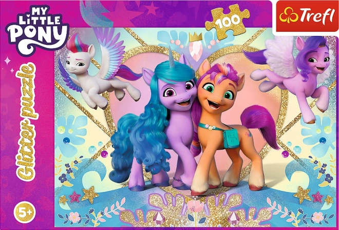 Die Glitter-Puzzles mit 100 Teilen My Little Pony Glitzernde Ponys wurden speziell für Pony-Fans entworfen. Jedes Teil und auch die Verpackung sind mit feinem goldenem Glitzer überzogen, der einen edlen Look verleiht. Durch das Zusammensetzen dieses Puzzles entsteht eine wunderschöne, funkelnde Dekoration fürs Kinderzimmer.