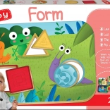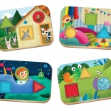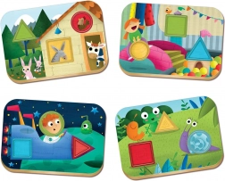 Dieses Spiel fördert die Aufmerksamkeit der Kinder, entwickelt ihre Vorstellungskraft und lehrt sie, grundlegende geometrische Formen und Farben in verschiedenen Umgebungen zu erkennen: auf dem Bauernhof, im Spielzimmer, auf der Wiese und im Weltraum.