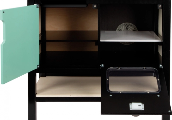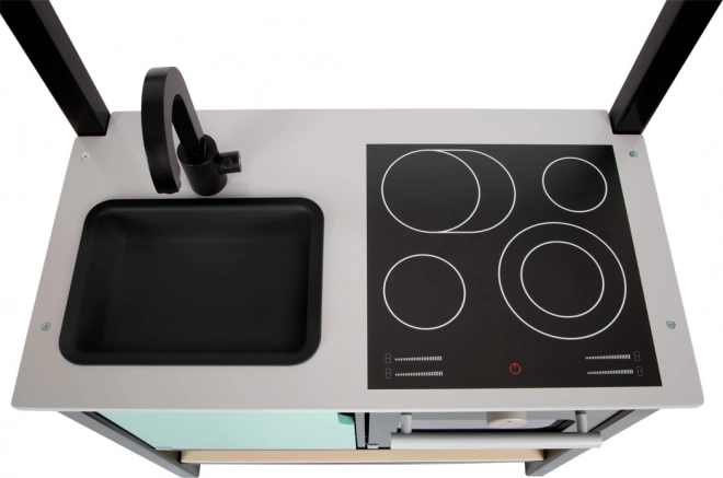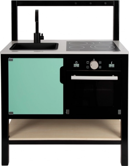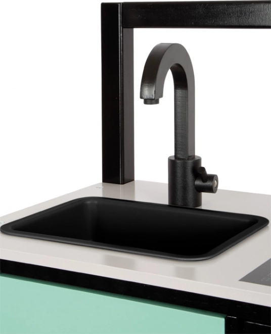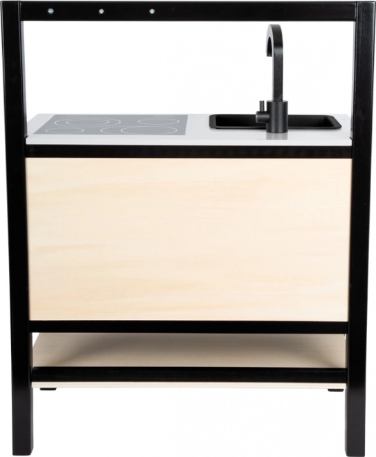 Diese visuell ansprechende Kinderküche bringt einen modernen Industrial-Look, der in jedem Kinderzimmer auffällt. Die leichte, aber stabile Konstruktion mit schwarzem Rahmen ermöglicht ein einfaches Umstellen, sodass der Spielort schnell gewechselt werden kann. Realistische Bedienelemente, illustrierte Geräte und funktionale Details regen die Fantasie an und fördern das selbstständige Spiel.