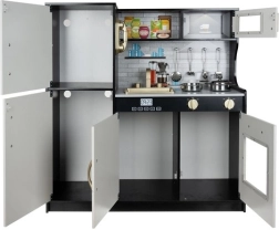 Die XL-Kinderküche aus hochwertigem Holz (MDF) überzeugt durch detailreiche Verarbeitung und Robustheit. Die LED-Lampe kann unter dem Schrank, im Schrank oder im Ofen platziert werden – so genießen Kinder echte Kochatmosphäre auch bei Dämmerlicht. Die drehbaren Knöpfe des Herdes erzeugen realistisches „Klicken“, was das Spielerlebnis noch intensiver macht.