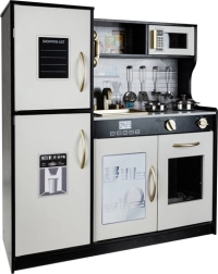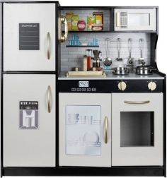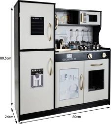 Die stilvolle XL-Holzküche von KRUZZEL in Schwarz, Weiß und Gold bietet Kindern ein realistisches Kocherlebnis. Sie verfügt über LED-Beleuchtung, Geräuscheffekte der Kochfelder, bewegliche Elemente sowie umfangreiches kostenloses Zubehör (Topf, Pfanne, Deckel, 4 Löffel). Herausnehmbares Spülbecken, Backofen, Mikrowelle und Schränke mit Klickverschluss fördern Kreativität, Lernen durch Spiel und Rollenspiele.