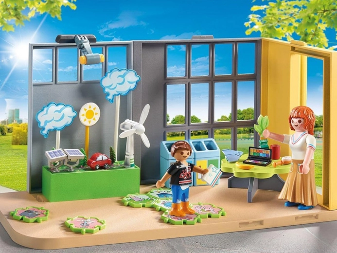 Enthalten sind Tonnen für die Mülltrennung, Pflanzen, ökologische Dekorationen, Elemente „grüner“ Infrastruktur sowie Schulausstattung. Das Set ist mit weiteren PLAYMOBIL-Bausätzen kompatibel (z. B. Erweiterungen für Klassenräume) und lässt sich so einfach in eine größere Schulwelt integrieren.