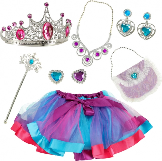 Das magische 9-teilige Set verwandelt jedes Kind im Handumdrehen in eine echte Prinzessin. Der bunte Tutu-Rock in Rosa-, Lila- und Blautönen besticht durch flauschige Tülllagen und einen bequemen Bund. Die elegante Tiara mit rosa Steinen, eine funkelnde Halskette und Ohrringe unterstreichen den festlichen Look, während Zauberstab und die niedliche Handtasche das Outfit perfekt abrunden.