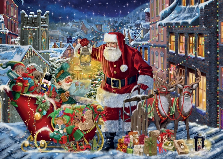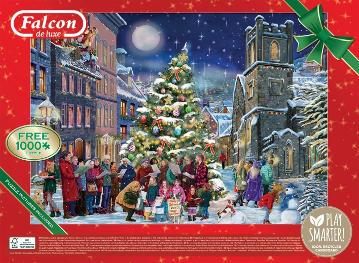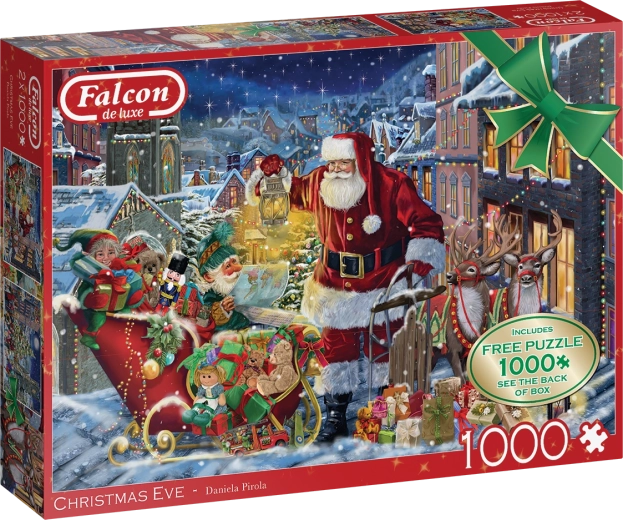 Entdecken Sie das Falcon Puzzle 'Weihnachtsabend' mit zwei wunderschönen Motiven von je 1000 Teilen. Perfekt, um in festliche Stimmung zu kommen und gemeinsam mit der Familie zu puzzeln.