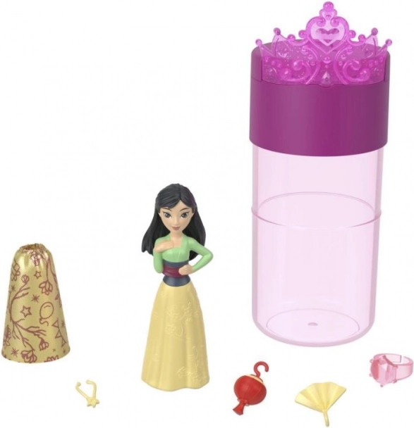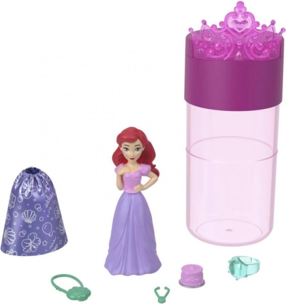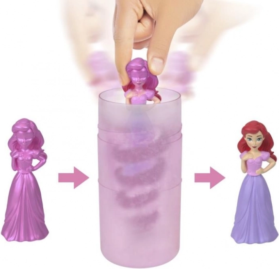 Beginnen Sie mit dem Auspacken der Röhre: Darin finden Sie eine kleine geheimnisvolle Puppe (ca. 3,5"/9 cm) mit einer Color-Reveal-Schicht sowie drei Beutel mit Zubehör. Füllen Sie die Röhre mit Wasser, tauchen Sie die Puppe ein und drehen Sie sie sanft – im Nu zeigt sich ihr charakteristischer Look, inspiriert von den beliebten Disney Filmen.