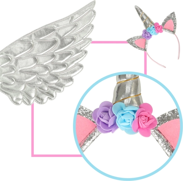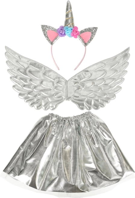 Dieses herrliche Kostüm ermöglicht es Ihnen, Ihr Kind in ein einzigartiges Einhorn zu verwandeln. Es besteht aus einem silbernen Rock, eleganten Flügeln und einem detailliert gestalteten Stirnband mit Rosen. Ideal für jede Gelegenheit, bei der Ihr Kind ein märchenhaftes Spiel genießen kann.
