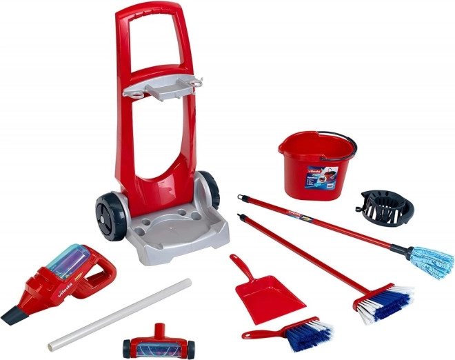 Der Wagen enthält verschiedene Reinigungswerkzeuge wie Mop, Besen und Staubtuch, die den Kindern viele Möglichkeiten zum Spielen bieten.