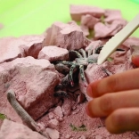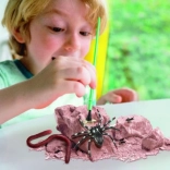 Der Gipsblock verbirgt realistische Figuren von Spinnen, Würmern und Ameisen. Kinder legen sie nach und nach mit dem beiliegenden Meißel und Pinsel frei.