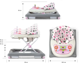 Das Produkt verfügt über ein Lernpanel mit vielen Überraschungen für kleine Entdecker: Lichter, Quietscher, Melodien, Rassel, Tasten und weitere bewegliche Elemente. Nach dem Herausnehmen des Panels aus der Wanne der Lauflernhilfe kann es als eigenständiges Spielzeug verwendet werden, z. B. als Reisebegleiter, und der obere Teil kann als Spieltisch dienen.