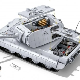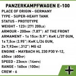 Dieses detailreiche Modell aus der Reihe historischer Klemmbausätze bildet den deutschen Prototyp PANZERKAMPFWAGEN E‑100 aus dem Ende des Zweiten Weltkriegs nach. Dank des großen Maßstabs ist auch das Innere ausgearbeitet – öffnen Sie die Serviceabdeckung, entnehmen Sie den Motor und werfen Sie einen Blick in den Turm. Realistische Funktionen wie drehbarer Turm, Rohrerhöhung und laufende Ketten machen das Modell zum attraktiven Ausstellungsstück und zugleich zu einem spielbaren Bausatz.