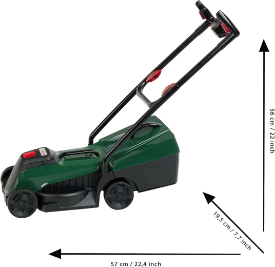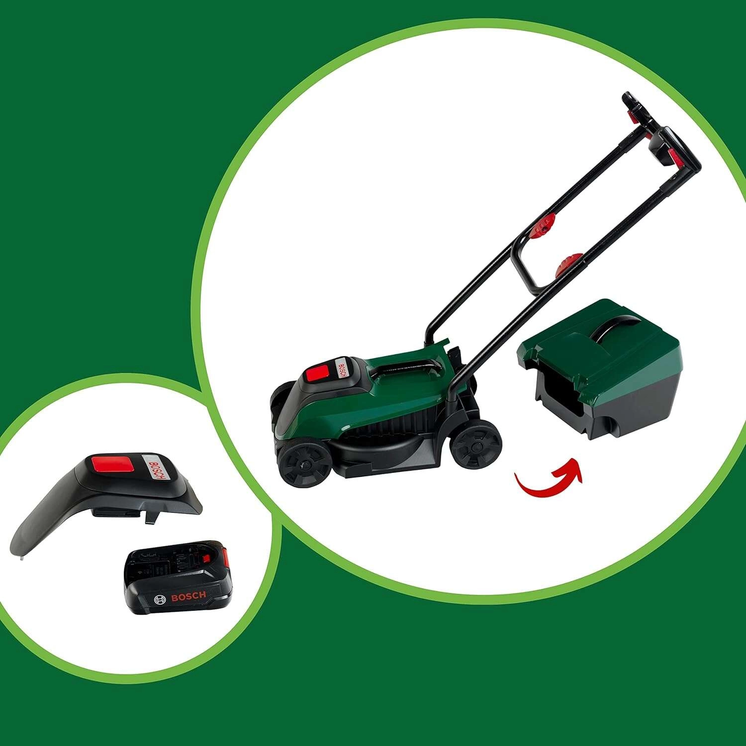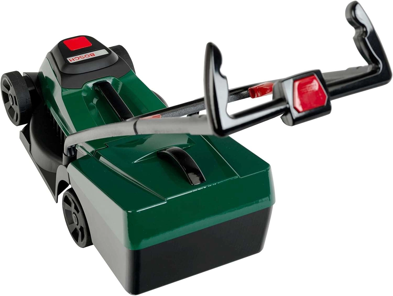 Dieser Kinderrasenmäher imitiert eine echte Maschine: Er hat ein dunkelgrünes Gehäuse, einen schwarzen Griff und bewegliche Räder, die sanft über verschiedene Untergründe rollen. Das integrierte, herausnehmbare Licht- und Soundmodul lässt auf Knopfdruck das BOSCH‑Logo aufleuchten und spielt realistische Motorgeräusche ab. Auch ohne Modul sind beim Schieben ein angenehmes mechanisches „Klicken“ und ein rhythmisches Rollen der Räder zu hören.