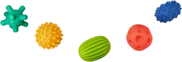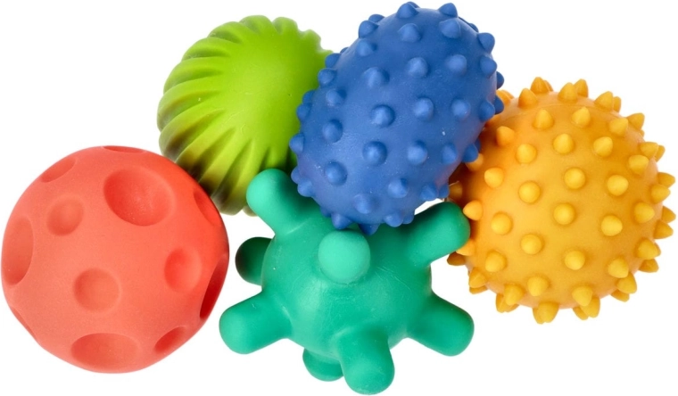 Das Set der Sensorik-Bälle SENSORKY bietet verschiedene Größen und Oberflächen mit Noppen für eine vielfältige taktil-sensorische Stimulation. Unterschiedliche Formen und Pastellfarben ziehen die Aufmerksamkeit des Kindes auf sich, unterstützen die Integration der Sinne und natürliches Lernen durch Spiel – von sanfter Massage bis zu Greifen, Rollen und Werfen.