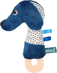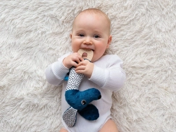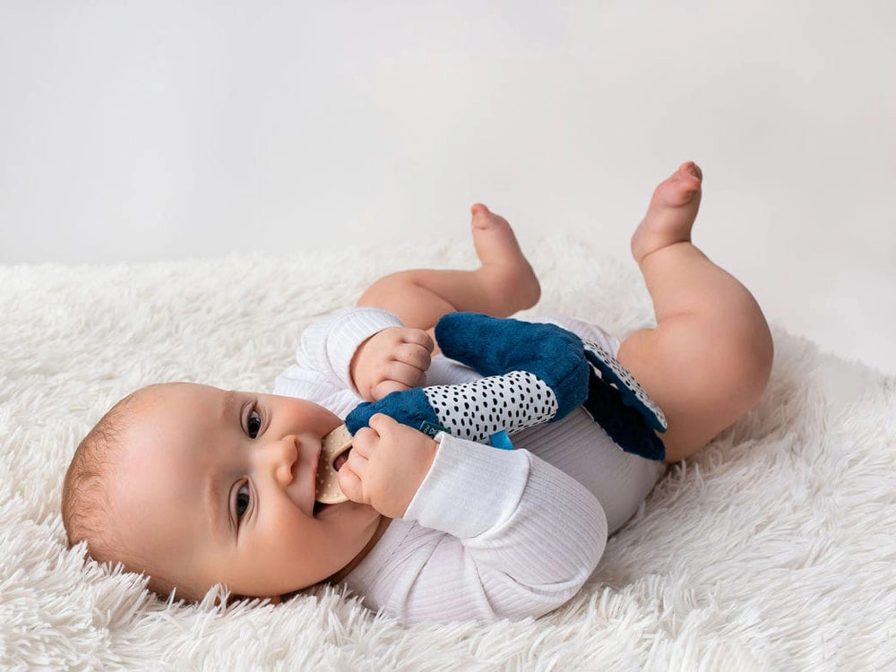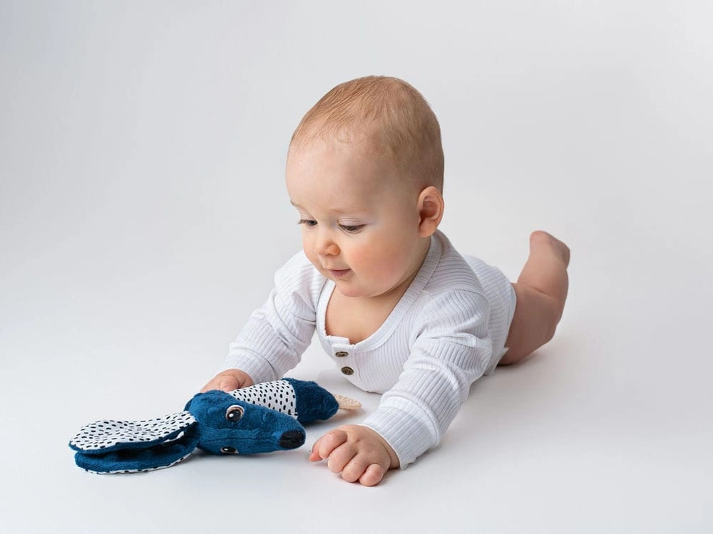 Jamiś ist ein kuschelweicher Begleiter, der unterhält und beruhigt. Kontrastreiche Materialien ziehen die Aufmerksamkeit von Neugeborenen auf sich, Quietsche und knisternde Ohren stimulieren das Gehör, während der strukturierte Silikon-Beißring das Zahnfleisch während des Zahnens sanft massiert. Dank leichtem Design und griffiger Form ideal für kleine Hände.