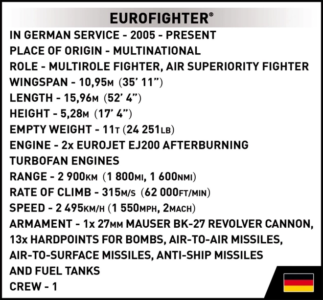 Detailreich umgesetztes Modell des EUROFIGHTER TYPHOON Mehrzweckjägers in den Farben der Luftwaffe mit realistischen Funktionen wie öffnender Kabine, beweglichen Elevons und der Möglichkeit, das Fahrwerk für eine saubere Ausstellungssilhouette auf dem beiliegenden Ständer leicht zu entfernen. Dank der verständlichen Anleitung gelingt der Aufbau auch weniger fortgeschrittenen Baumeistern problemlos.