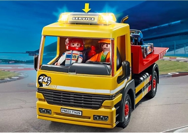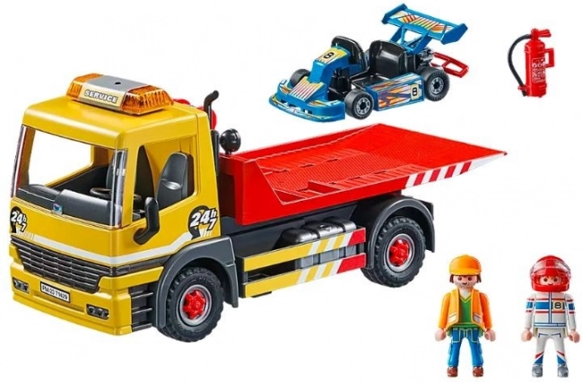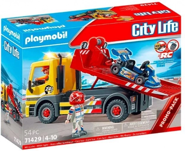 Wir präsentieren den Abschleppwagen, der jederzeit bereit ist zu helfen. Scheinwerfer und ein zusätzliches Gokart machen dieses Set noch unterhaltsamer.