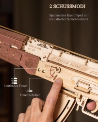 Das Modell überzeugt durch präzise Verarbeitung aus Naturholz, Lasergravuren und bewegliche Elemente, die die Mechanik einer echten Waffe realistisch simulieren.