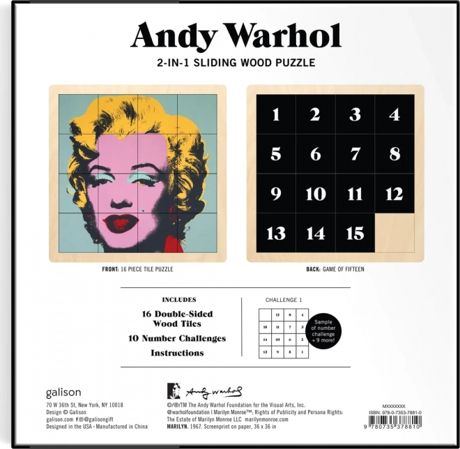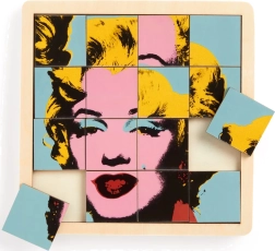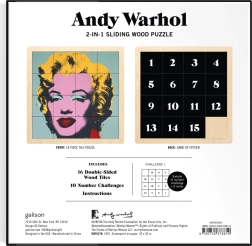 Dieses einzigartige, schiebbare Holzpuzzle bietet stundenlangen Spaß und kreative Herausforderungen. Auf der einen Seite finden Sie das ikonische Andy Warhol-Motiv, auf der anderen ein Zahlenrätsel: Fifteen Puzzle. Das Puzzle mit einer Größe von ca. 15 x 15 cm ist so konzipiert, dass es Konzentration und Strategie erfordert.