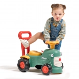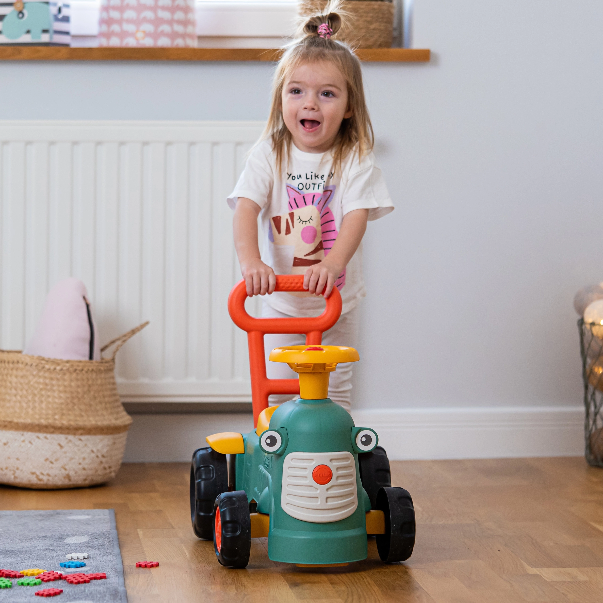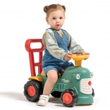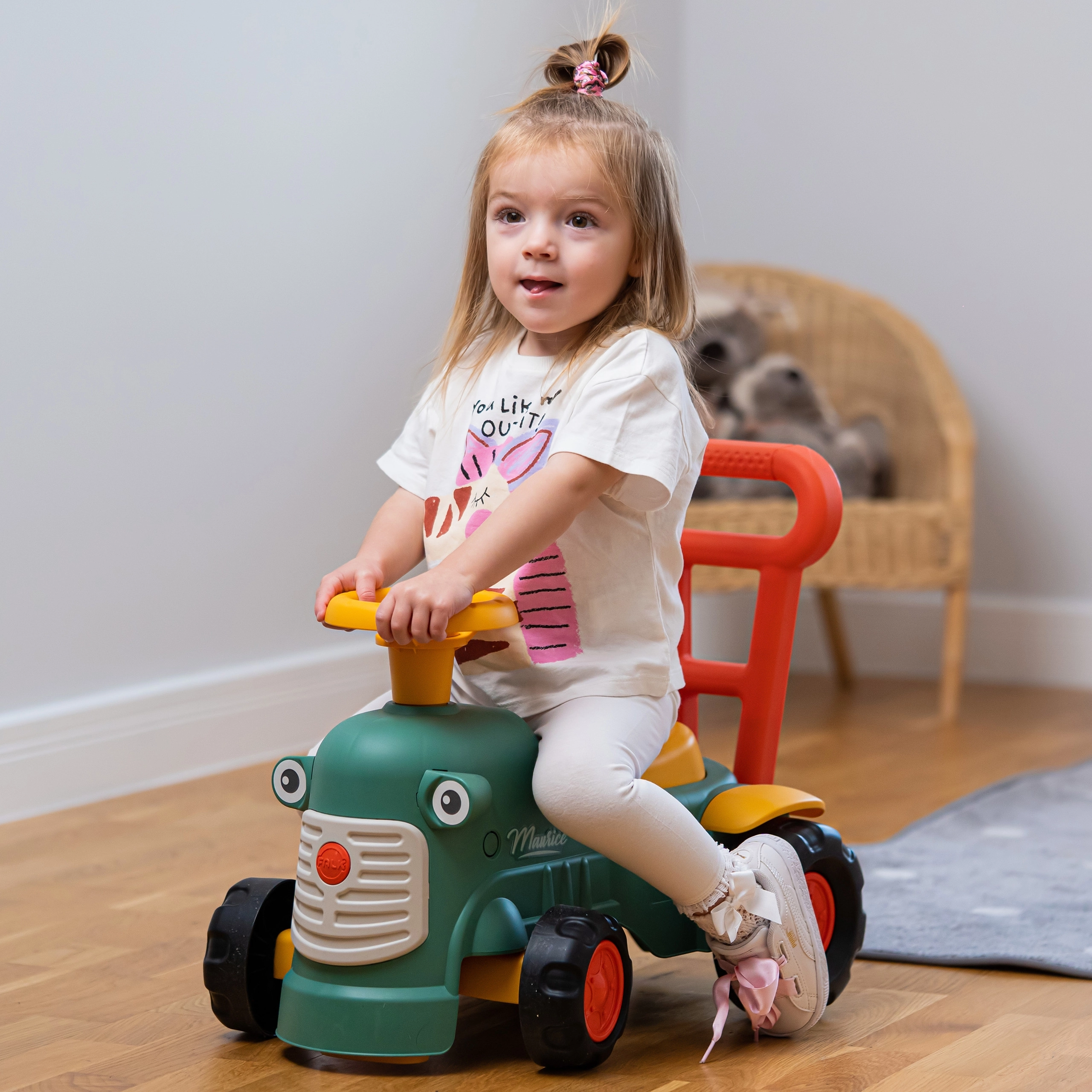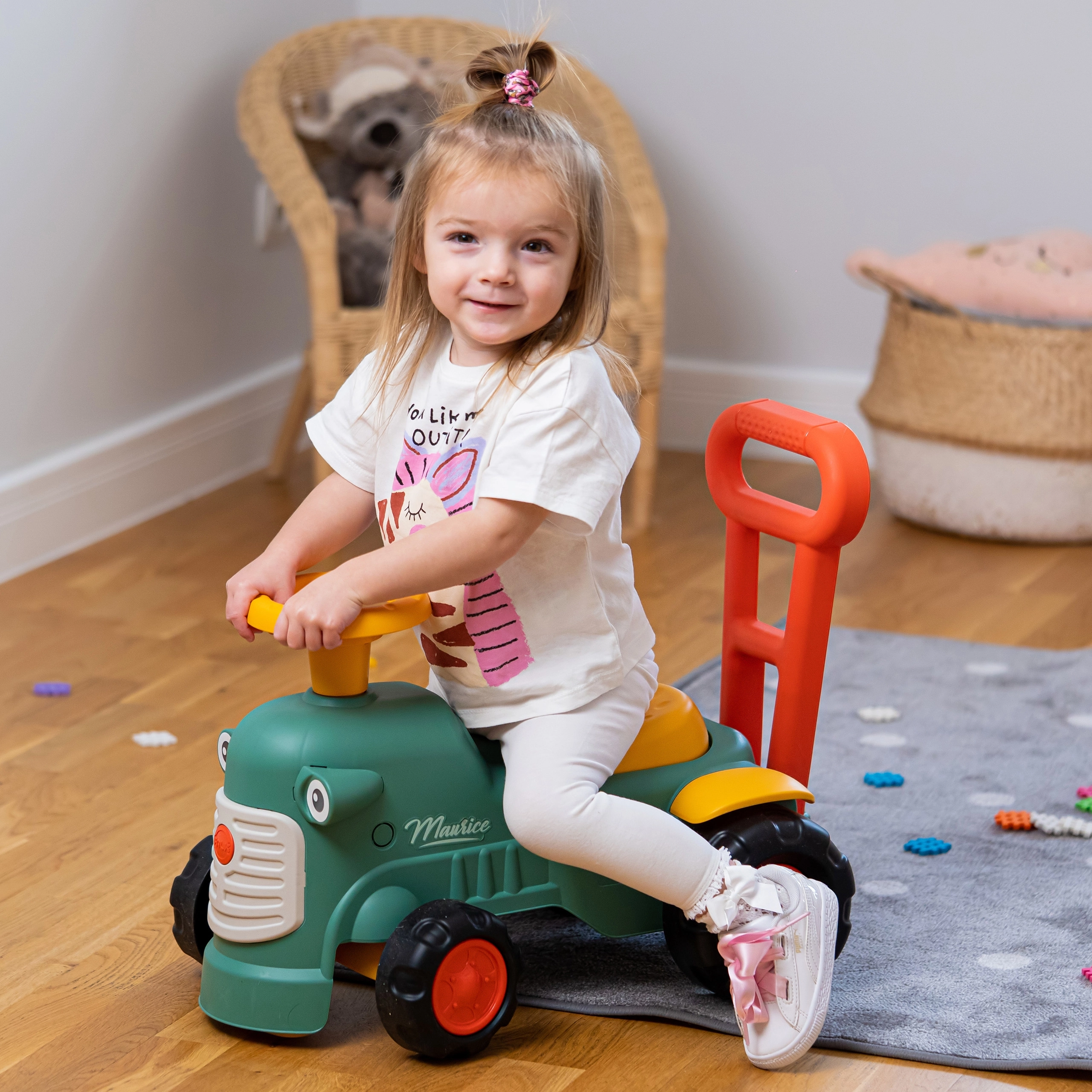 Das Rutschfahrzeug-Traktor FALK Maurice verbindet Fahrspaß mit dem Erlernen des Gehens. Das Kind kann mit dem Lenkrad mit Hupe fahren und steuern oder sich am ergonomischen hinteren Griff hochziehen und die ersten Schritte trainieren. Der niedrige Sitz (ca. 23 cm) erleichtert das Aufsitzen, während die breiten Räder Stabilität auf glatten Böden und Teppichen bieten.