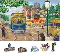 Dieses Premium-Holzpuzzle zeigt eine lebendige Szene mit einer Retro-Straßenbahn und einer Gasse voller zeittypischer Details. Dank lasergeschnittener Teile mit glatten Kanten ist das Puzzeln Freude und Herausforderung zugleich. Die doppelseitige Ausführung ermöglicht das Puzzeln auf der Vorderseite nach dem Motiv oder auf der Rückseite nach einem wiederkehrenden Muster.