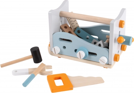 Enthält viele Werkzeuge wie Säge, Hammer und Schraubendreher sowie weitere Holzelemente.