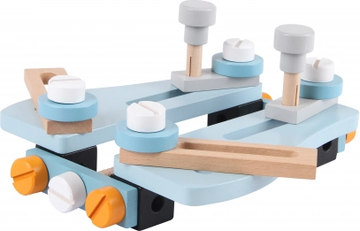Dieses Spielzeug enthält Werkzeuge, wie eine Säge, einen Hammer, ein Lineal, einen Schraubendreher und einen Schraubenschlüssel. Neben diesen Werkzeugen finden Sie auch jede Menge Schrauben, Unterlegscheiben und Holzelemente, die verbunden und verschraubt werden können, um stundenlangen Spaß zu bieten.