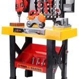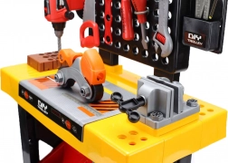 Bohrmaschine, Säge, Hammer, Schraubendreher, Schlüssel, Schrauben, Muttern und Verbinder – alles, was Kinder für kreatives Bauen und Rollenspiele brauchen.