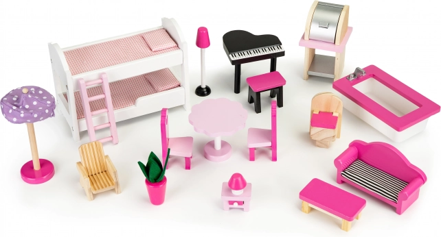 Im Lieferumfang ist ein Set aus 16 Möbelstücken enthalten, darunter ein Bettchen, ein Klavier, ein Tisch und weitere Elemente, die eine freie Anordnung ermöglichen.