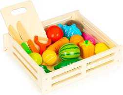 Dank magnetischer Verbindungen lassen sich die einzelnen Stücke mit dem Holzmesser sicher 'aufschneiden' und wieder zusammenfügen. So fördert das Spiel die Feinmotorik, die Hand-Auge-Koordination und das Lernen durch Nachahmung. Die praktische Holzbox erleichtert das Verstauen aller Teile.
