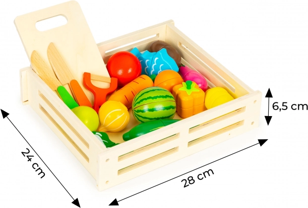- Box, Schneidebrett, 2× Messer (Imitation), Schäler (Imitation), verschiedene Obst- und Gemüsestücke