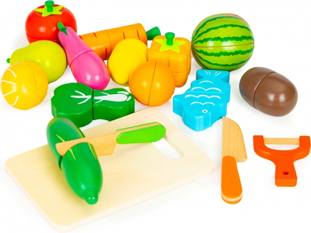 - Lieferumfang: Box, Schneidebrett, 2× Messer (Imitation), Schäler (Imitation), Tomate, Birne, Gurke, Zitrone, Fisch, Zwiebel, Kiwi, Karotte, Kürbis, Melone, Brokkoli, Aubergine, Orange.