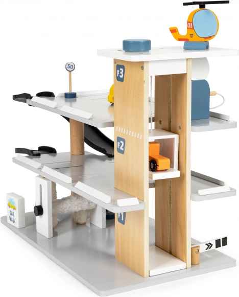 Drei Parkebenen, Abfahrtsrampen und eine Dachfläche als Landeplatz für den Hubschrauber bieten endlose Spielszenarien und das Erlernen von Verkehrssituationen.