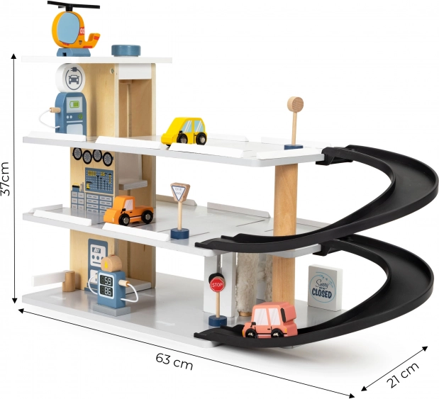 Diese mehrstöckige Holzgarage bietet Kindern eine echte Action-Zone: Autos flitzen über die Rampen zwischen den Etagen, halten an Verkehrsschildern und lassen sich dank des beweglichen Aufzugs bequem nach oben und unten transportieren. Auf dem Dach wartet ein Heliport, auf dem der beiliegende Hubschrauber landen kann.